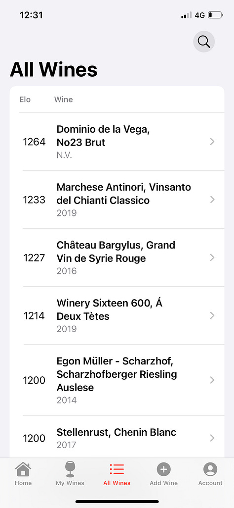 It is a nifty little app if I may say so myself, if not without its foibles, that I hope can be of some aid in tracking a users preferences and tasting history, while of course rating wines in the process. Another feature of this app, which I think is as interesting as the resulting Elo score, is that it is possible to see the match history of any given wine. Rather than simply relying on the numerical score and its relative position among other wines listed, you can see exactly what head-to-head comparisons have been made which resulted in that wine’s Elo rating. This is a form of insight and transparency that is completely absent from current wine scores. Each individual assessment is of course highly subjective, but the aggregate is interesting nevertheless, allowing anyone curious enough to in theory attempt to replicate the results for any given wine. For a winemaker I can also imagine it would be of interest to see such direct comparisons, made by users actually drinking and enjoying their wines, and it might lead to some unexpected outcomes.