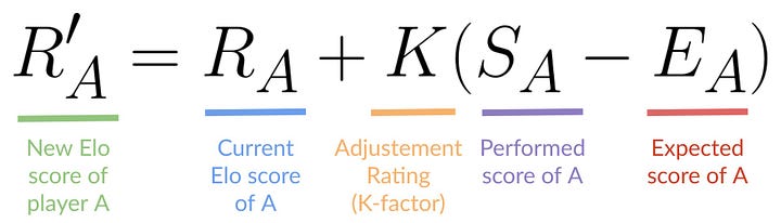 The Elo system works by assigning a numerical rating to each player, which changes based on the outcome of games and the ratings of their opponents. When the results of a chess game is evaluated, the expected outcome is calculated based on the difference between the players current scores, representing the probability that one player will win over the other. The points exchanged between players once the outcome of the match is known is proportional to the magnitude of the upset, adjusted for a scaling factor known as K.